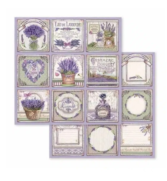 Ez a kivágható kártyákkal ellátott scrapbook lap a levendula finom varázsát hozza el kreatív projektjeihez. A francia vintage stílusú dizájn a lila, krém és pasztellzöld elegáns árnyalatait ötvözi, finom virágmotívumokkal, dekoratív szövegekkel és klasszikus parfümök ihlette elemekkel kiegészítve. Minden négyzet más díszítést tartalmaz: rusztikus kosarakban elhelyezett levendulacsokrok, illatos címkék, díszes keretek, levendulamezők képei és speciálisan kialakított helyek személyre szabott jegyzetek vagy üzenetek számára.