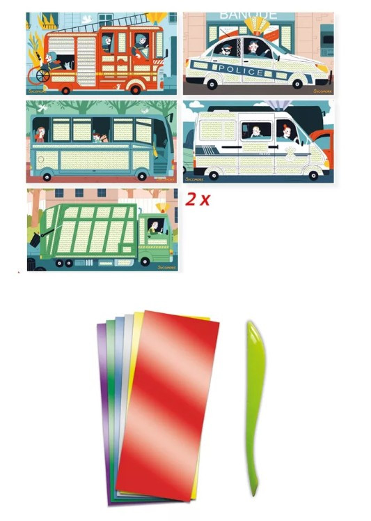 A Sycomore Artissimo Díszíts fémfóliával - Járművek csomagban található eszköz segítségével eltávolíthatod a képek egyes elemeiről a ragasztót védő rétegeket, majd fémfóliákkal dekorálhatod ki őket.
