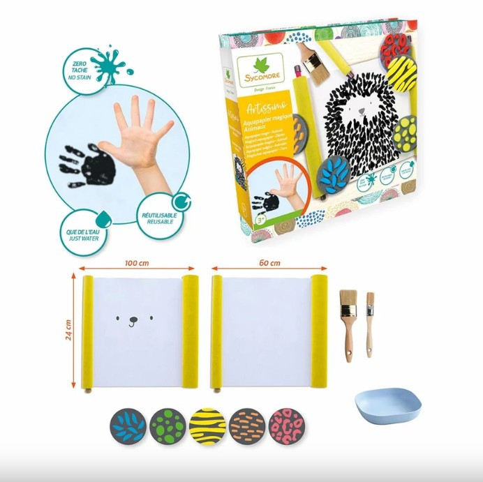 A Sycomore Artissimo aquapapír varázslat - állatok (CREA035) egy kreatív készlet, amely lehetővé teszi a gyerekek számára, hogy vízzel varázsoljanak színes képeket. A készlet segítségével állatos motívumokat lehet megjeleníteni, miközben a papír száradás után újra felhasználható, így hosszan tartó kreatív élményt nyújt.