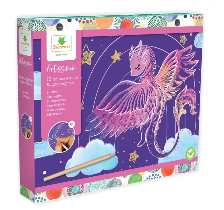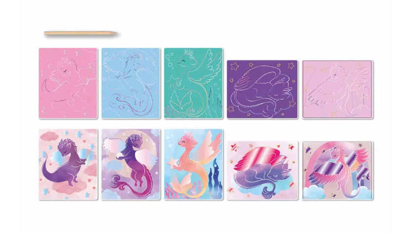 Kreatív gyermekjáték sárkányos kaparótáblákkal — 5 éves kortól ajánlott művészeti készlet, ideális kreatív tevékenységekhez és a képzelet fejlesztéséhez. A gyerekek a táblák különleges felületét kapargatva fedezhetik fel a varázslatos színű sárkányokkal díszített látványos illusztrációkat, így a játék kreatív és pihentető élménnyé válik.