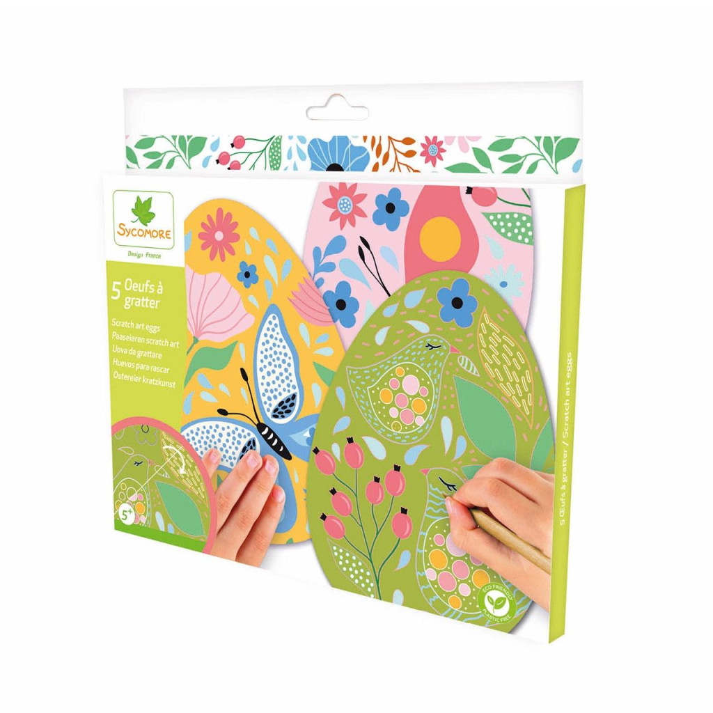 A Sycomore Scratch Art kreatív készlettel – tojásdíszítéssel a gyerekek 5 látványos színes képet alkothatnak a speciális kaparós technikával. A táblák felületét fekete réteg borítja, alatta pedig élénk színek és dekoratív minták rejtőznek.
