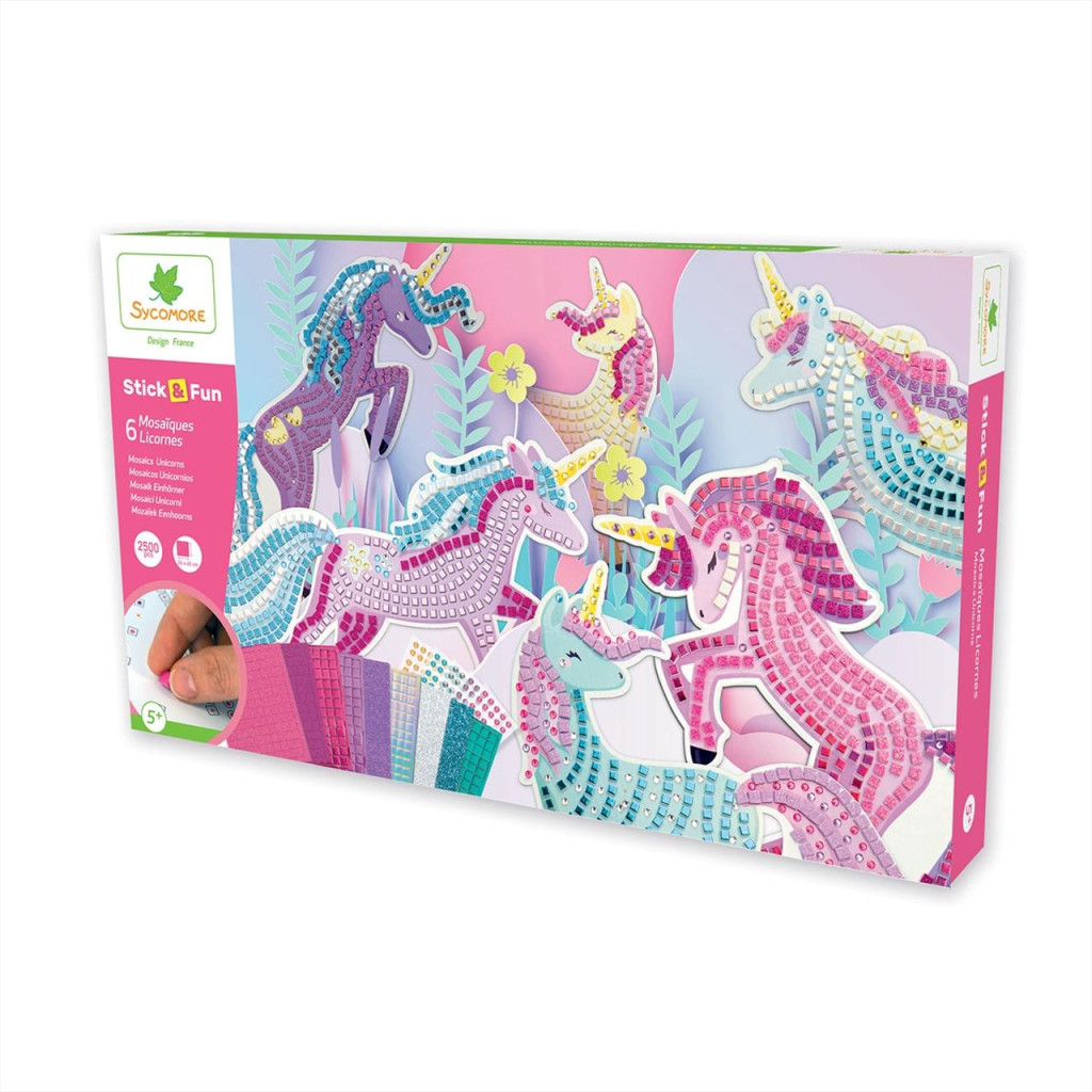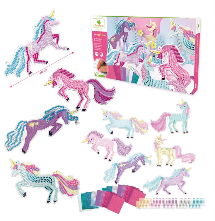 Lépj be egy varázslatos és színes világba a Sycomore Stick'n Fun nagyméretű unikornis készlettel! Ez a kreatív készlet lehetőséget kínál a gyerekeknek látványos mozaikfestmények készítésére, öntapadós mozaikdarabokkal és fényes elemekkel díszítve, az unikornisok varázslatos univerzuma ihlette formában.