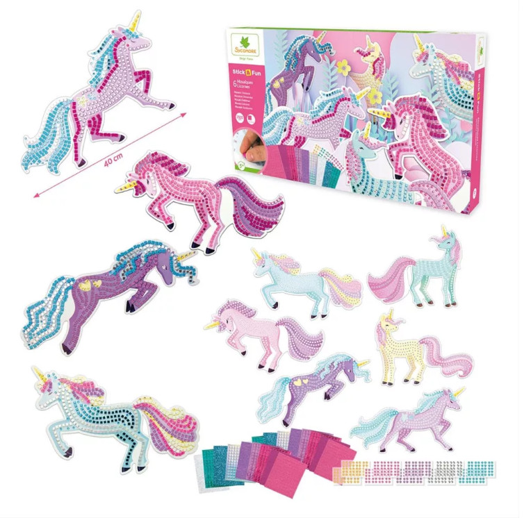 Lépj be egy varázslatos, színekkel teli világba a Sycomore Stick’n Fun kreatív készlettel – Unikornisok! Ez a látványos készlet lehetővé teszi a gyerekek számára, hogy dekoratív unikornis figurákat készítsenek öntapadós mozaiklapok és fényes darabok segítségével, különleges vizuális eredmény érdekében.