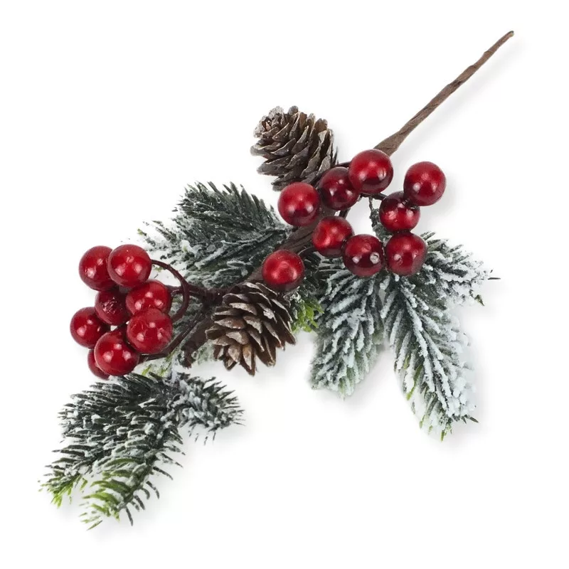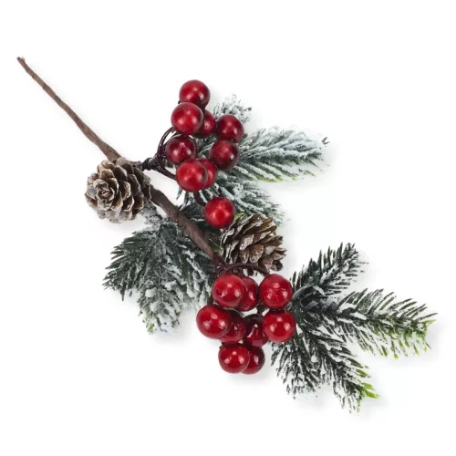 Tobozos, piros bogyós fenyőág pick műnövény dekor: otthoni vagy kirakati díszítéshez. Önmagában vagy kiegészítő díszítéshez, készítményekhez egyaránt használható.
