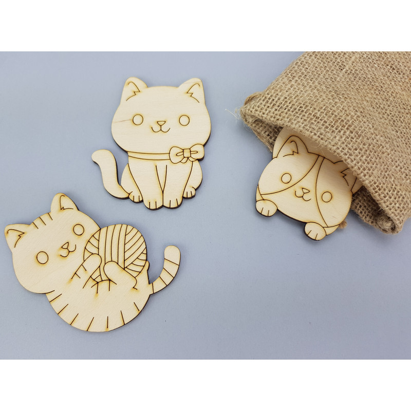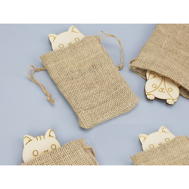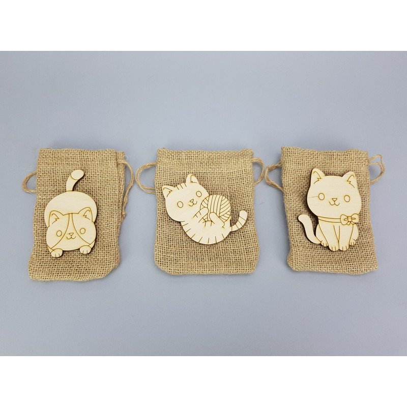 Az egyedi mintájú, fából készült cuki macska formáink mindegyike beköltözött egy zsákba. Azt mi sem tudjuk, hogy melyik mely zsákba került, így véletlenszerűen fognak gazdára találni.