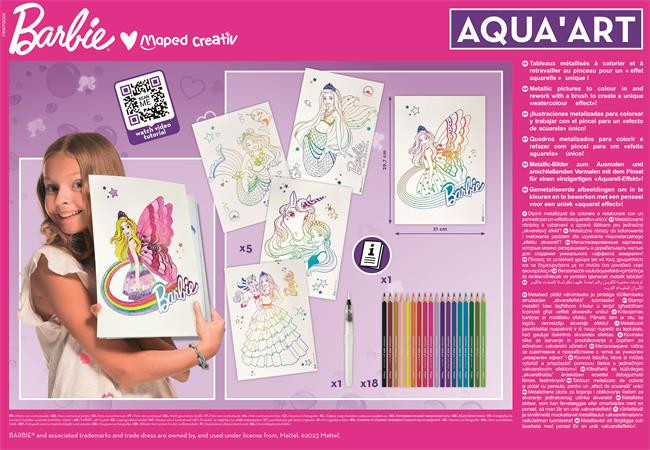 A MAPED CREATIV Barbie Aqua Art – Maxi Set egy komplett akvarell festőkészlet gyerekeknek, amely akvarell ceruzákat és metál hatású táblákat kombinál, hogy poszterhatású művészi alkotásokat hozzon létre. Ideális a rajzolás, a színezés és a Barbie karakterek iránt szenvedélyesen érdeklődő gyerekek számára.