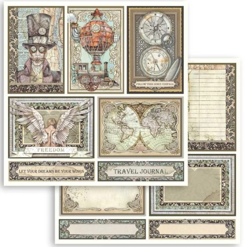 Scrapbook kétoldalas papír – utazási / steampunk témájú kártyák